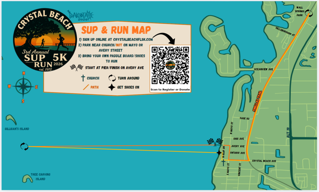 Every step and paddle supports Crystal Beach Community Enrichment – helping preserve Live Oak Park, our shore, shoreline and the historic Crystal Beach Community Pier.This event is not sponsored, endorsed or affiliated with Palm Harbor Parks and Recreation.